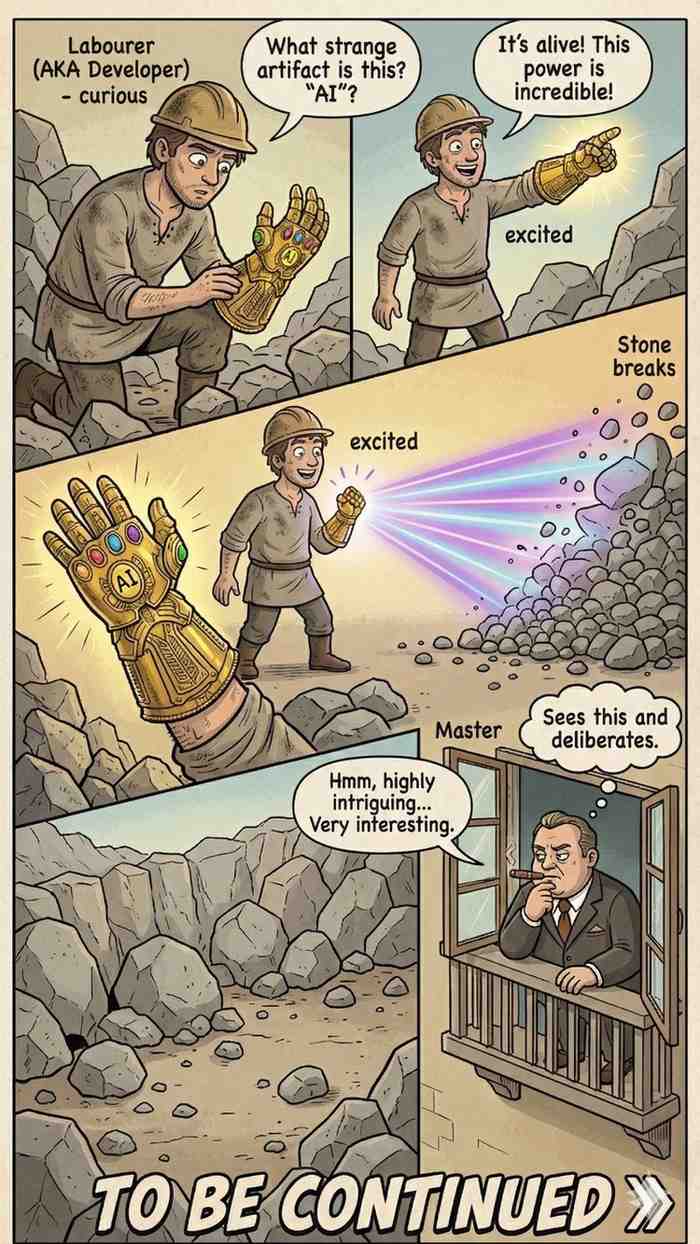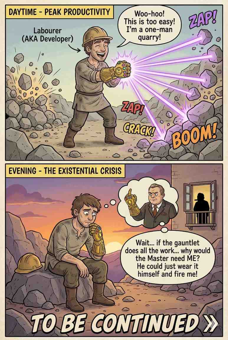 If the AI can do my work… what happens to me? Lately, many engineers myself included have felt this strange mix of excitement and unease. So I tried to explain the situation to myself using a simple satirical metaphor.