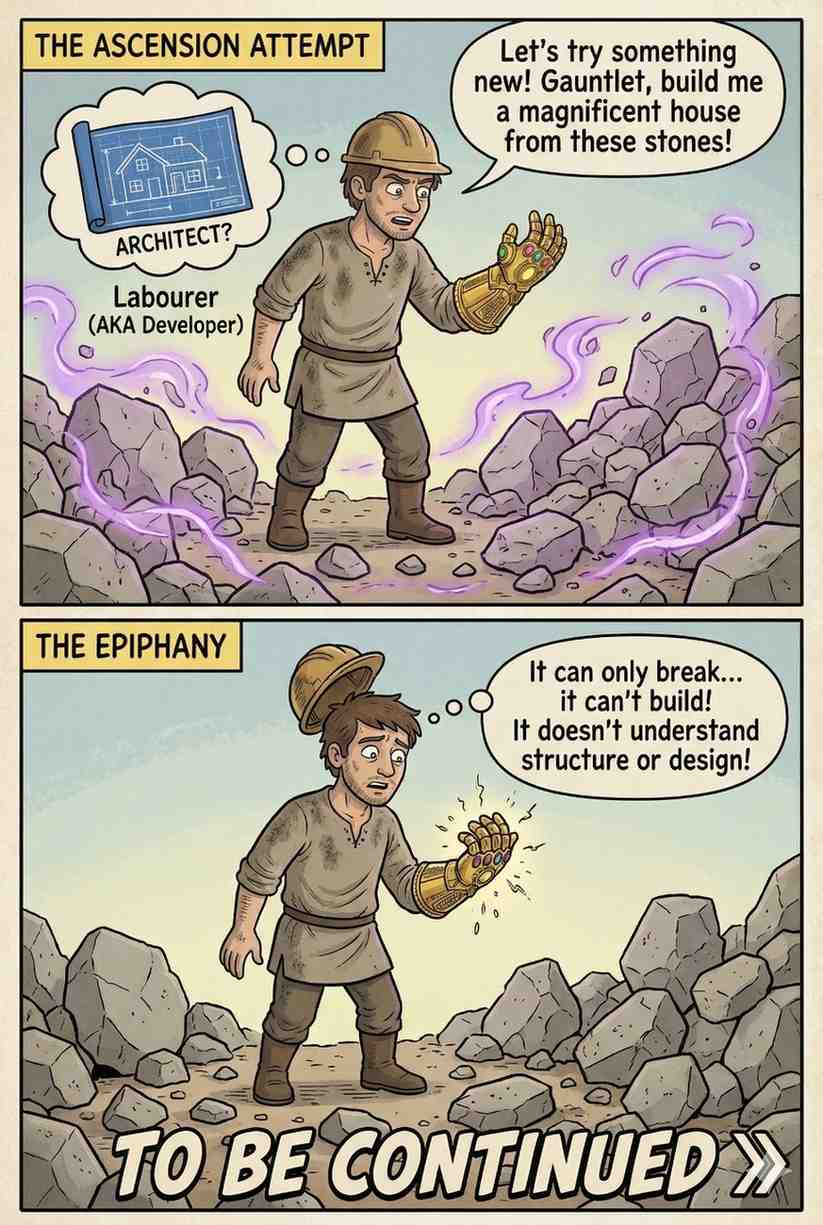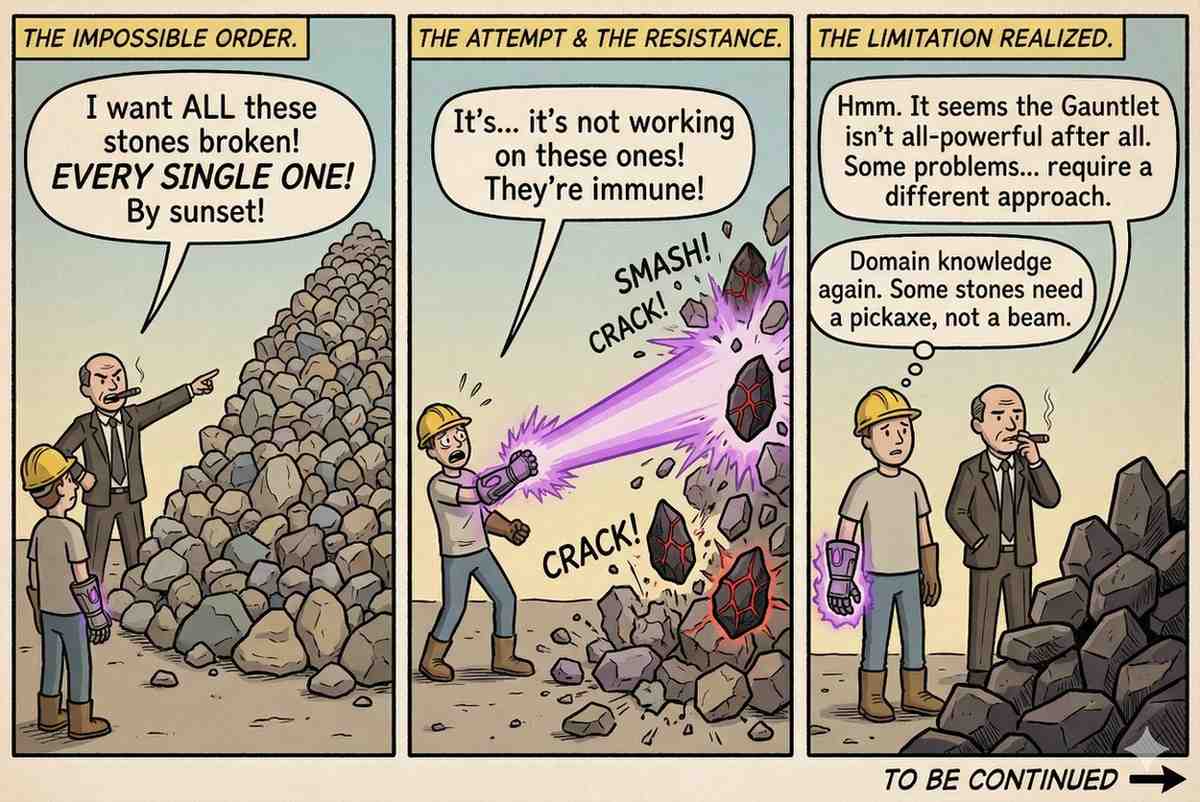 He commands the gauntlet to assemble the stones. Nothing happens. The rocks remain rocks. The gauntlet fires beams. But it does not understand structure. It does not understand design. It certainly does not understand architecture.