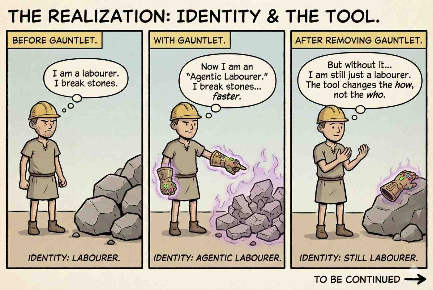 If this gauntlet does all the work… why would the Master need me? Perhaps the Master could simply wear it himself. Perhaps Logan has just automated his own job. And suddenly the miraculous tool feels less like a gift… …and more like a threat.